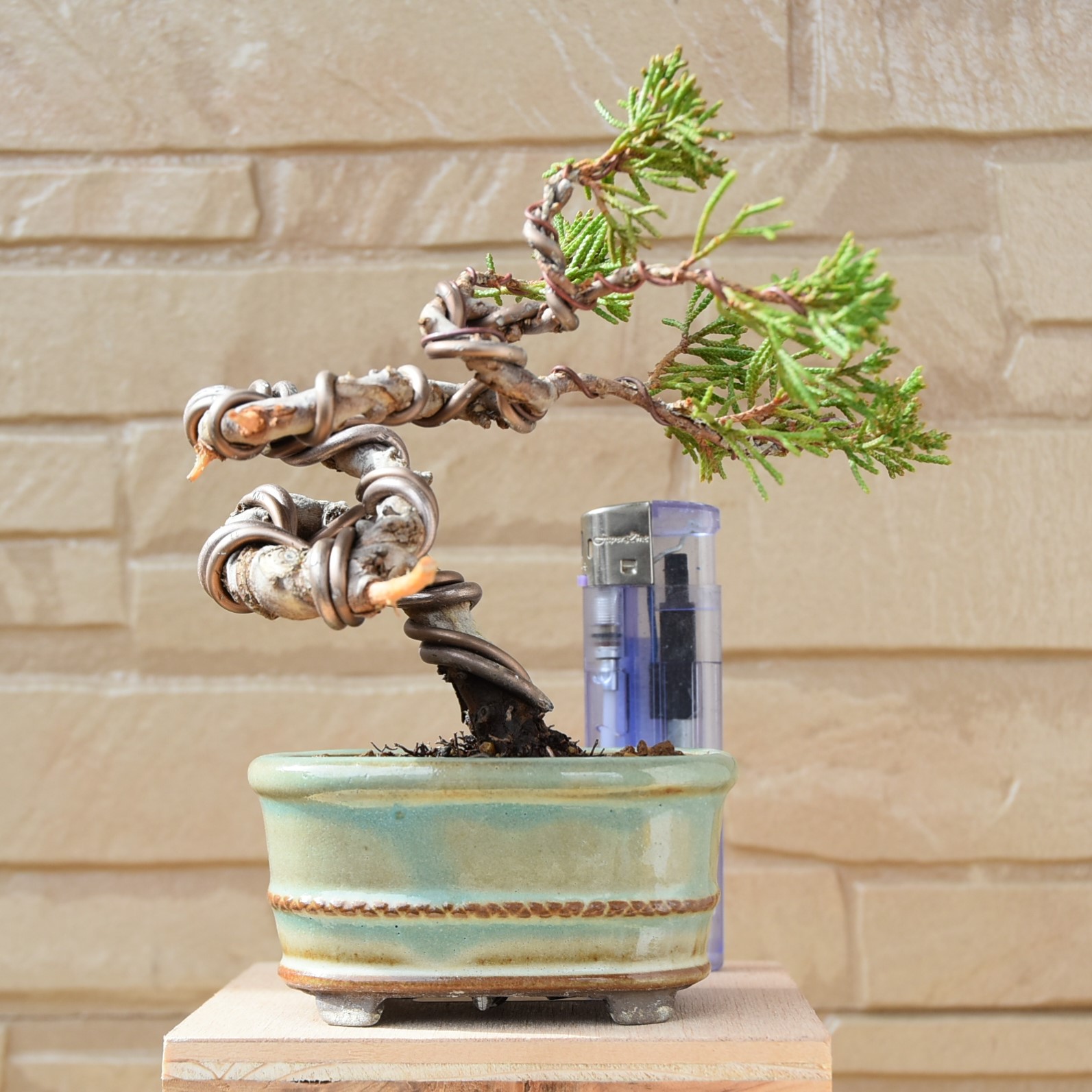 その中でも当店の「一押し商品」8cm弱の豆盆栽です。長年手塩にかけた「新作の真柏ミニ盆栽」です。